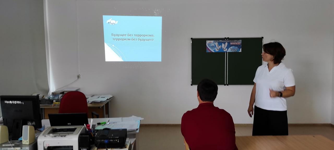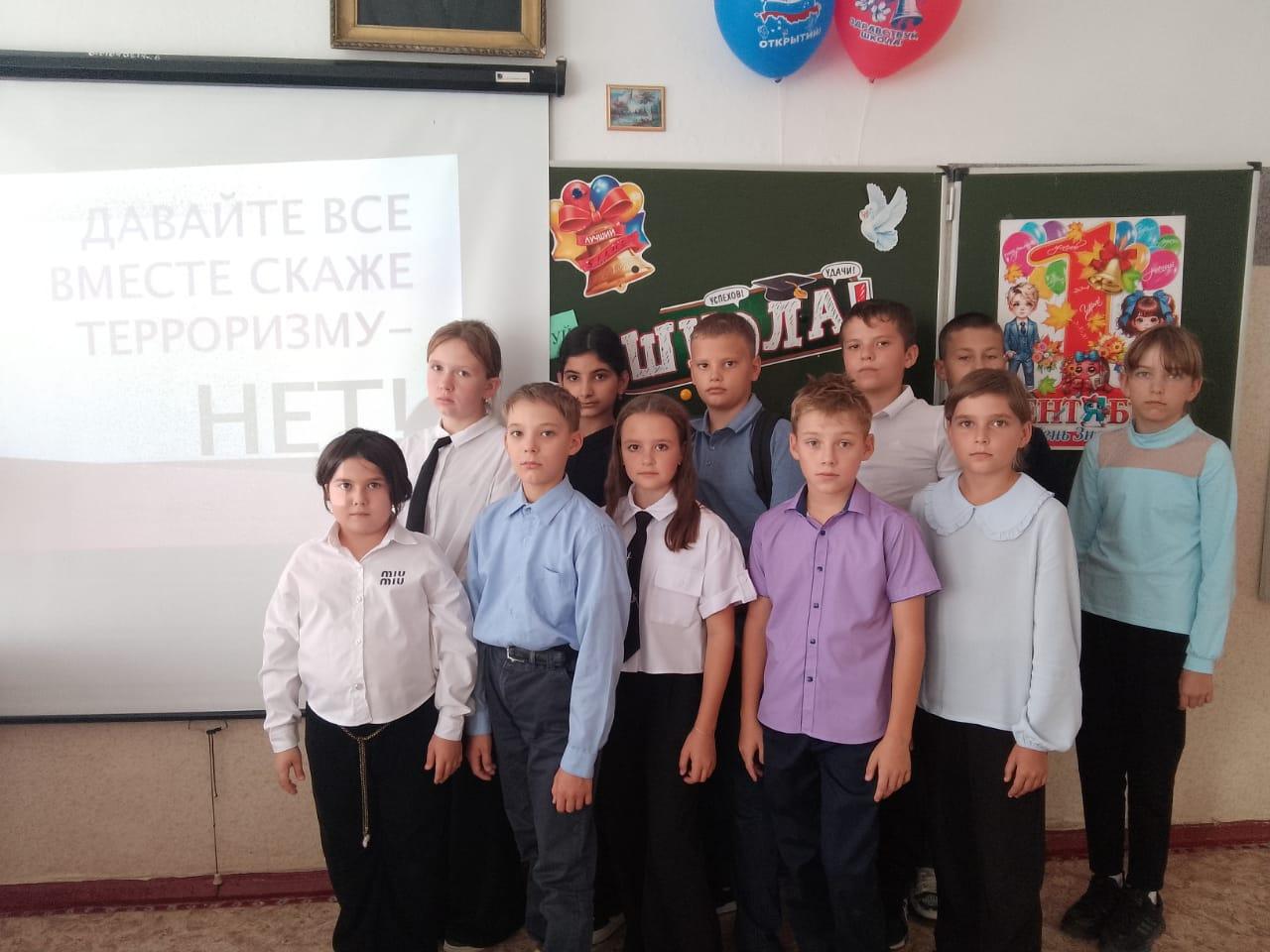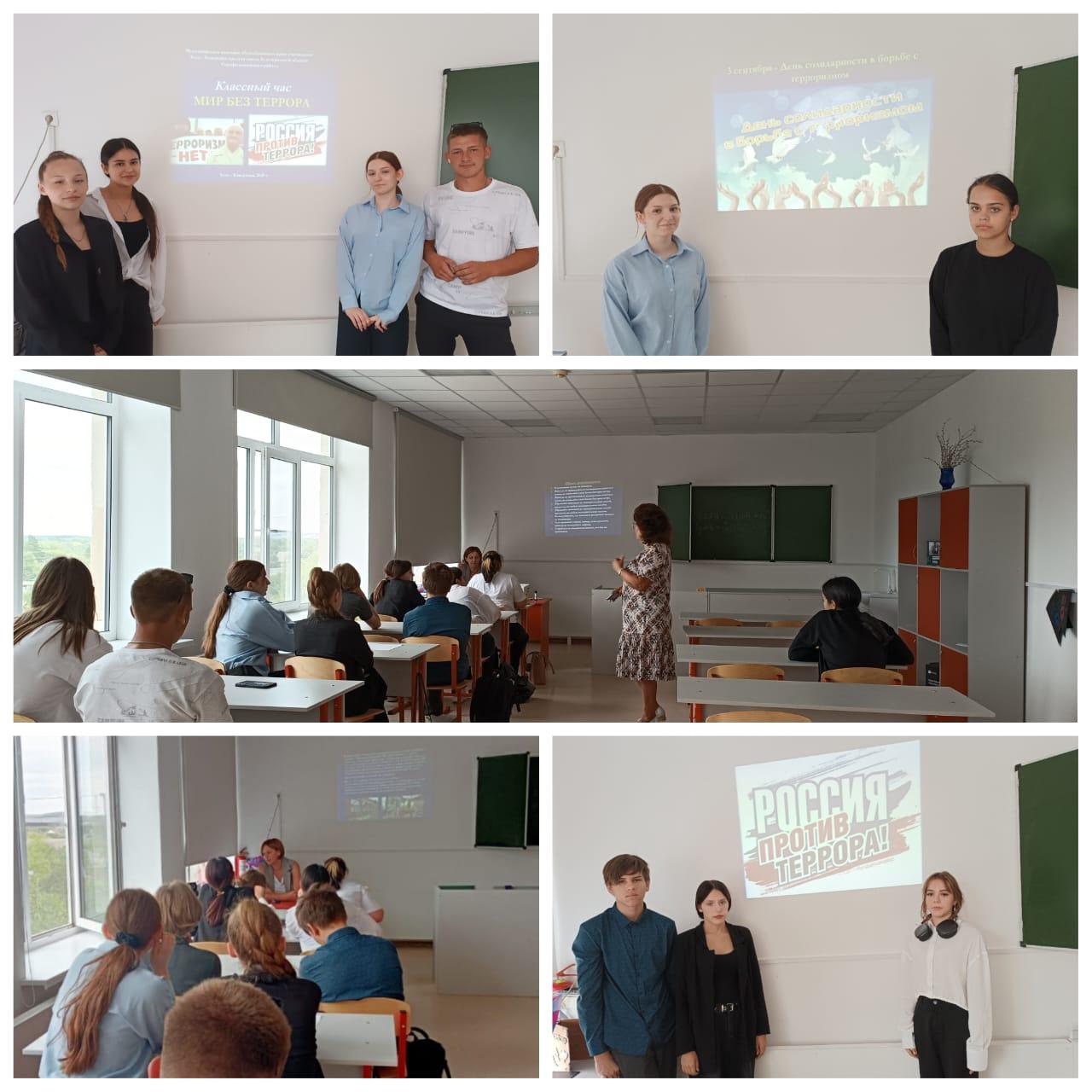 Во всех классах прошли тематические классные часы под названиями «Будущее без терроризма, терроризм без будущего» и урок предупреждение "Наш мир без террора". Классные руководители поговорили с учениками о ценности человеческой жизни, важности взаимопомощи и бдительности в современном мире.